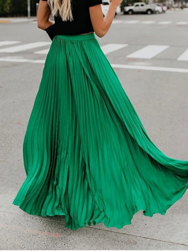 Women's Elegant Streetwear Swing Ankle-Length Skirts Street Holiday Solid Colored Pleated Mid Waist Green Black Pink S M L / Maxi / Micro-elastic #7593777