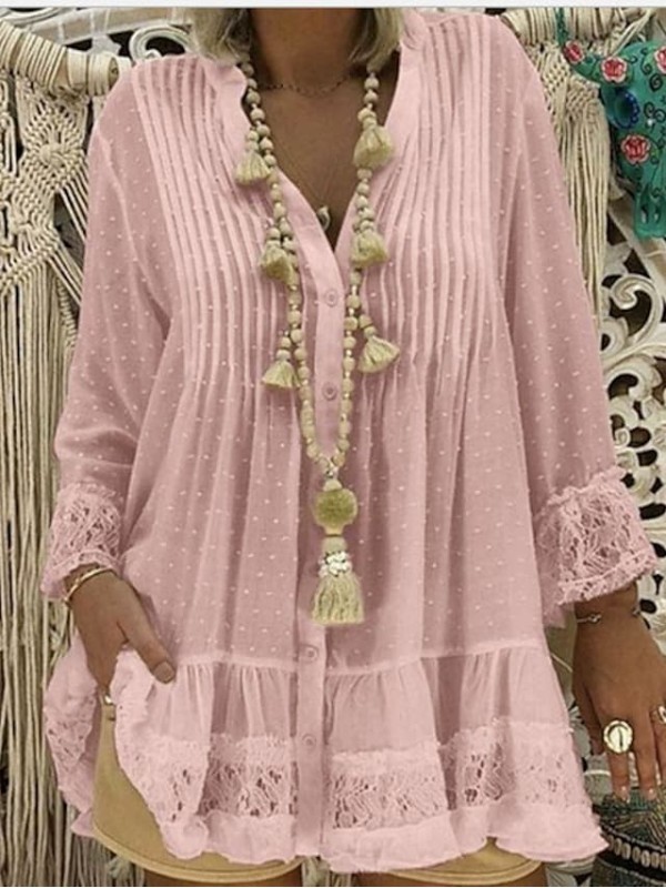 Women's Plus Size Blouse Eyelet top Shirt Solid Colored Pleated Lace V Neck Tops Loose White Pink Khaki #7958421