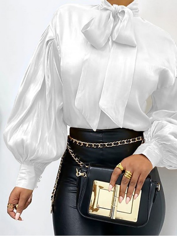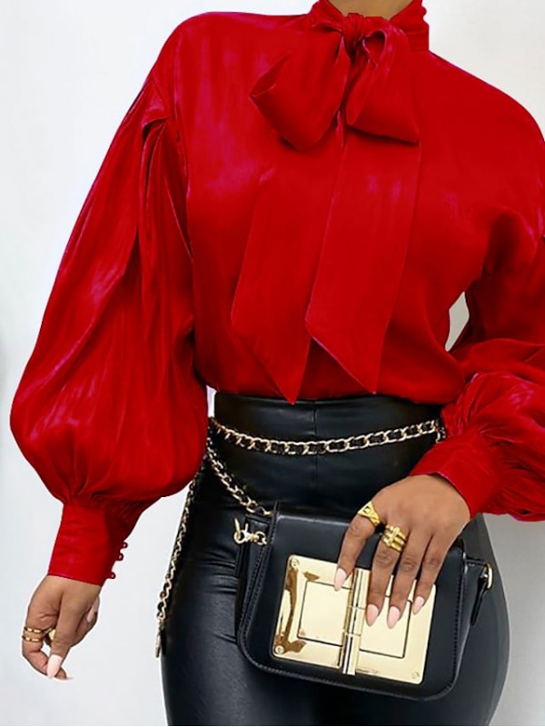 Women's Blouse Shirt Plain Sparkly Glittery Lace up High Neck Casual Streetwear Tops Lantern Sleeve White Red Yellow #8904256