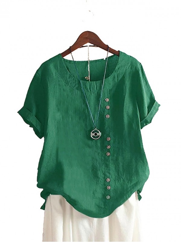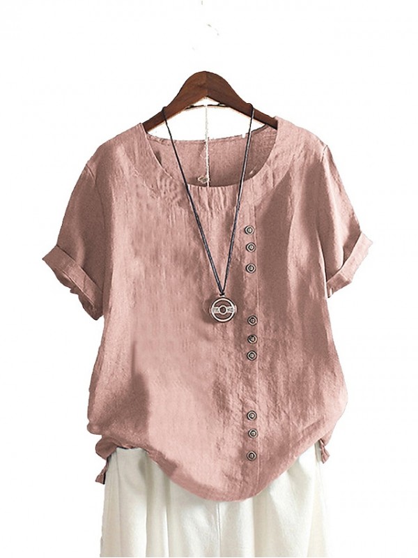 Women's Blouse Plain Button Round Neck Casual Tops Loose Blushing Pink Green White #8602000