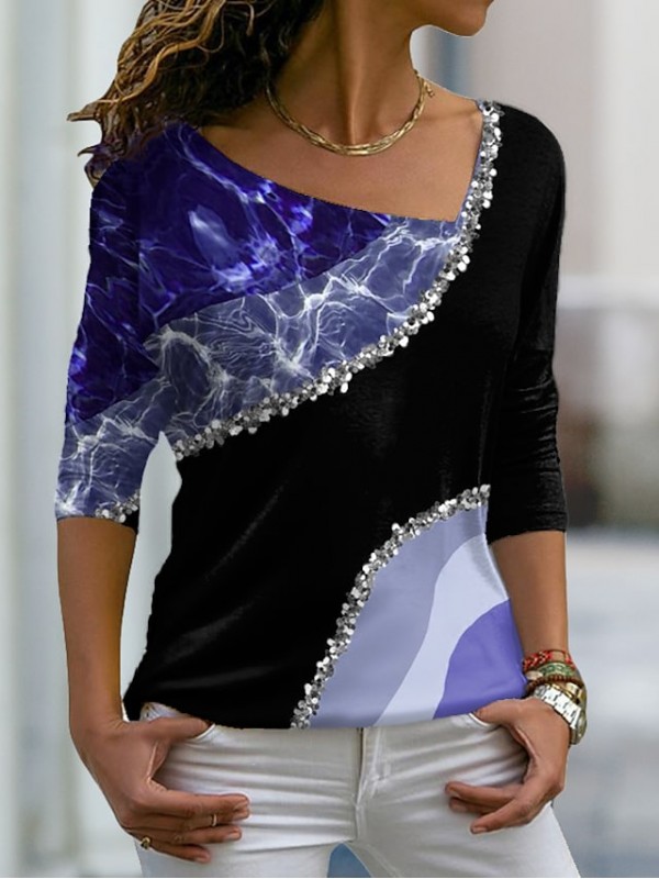 Women's Abstract Painting T shirt Graphic Color Block Print V Neck Basic Tops Green Blue Purple / 3D Print #8966658