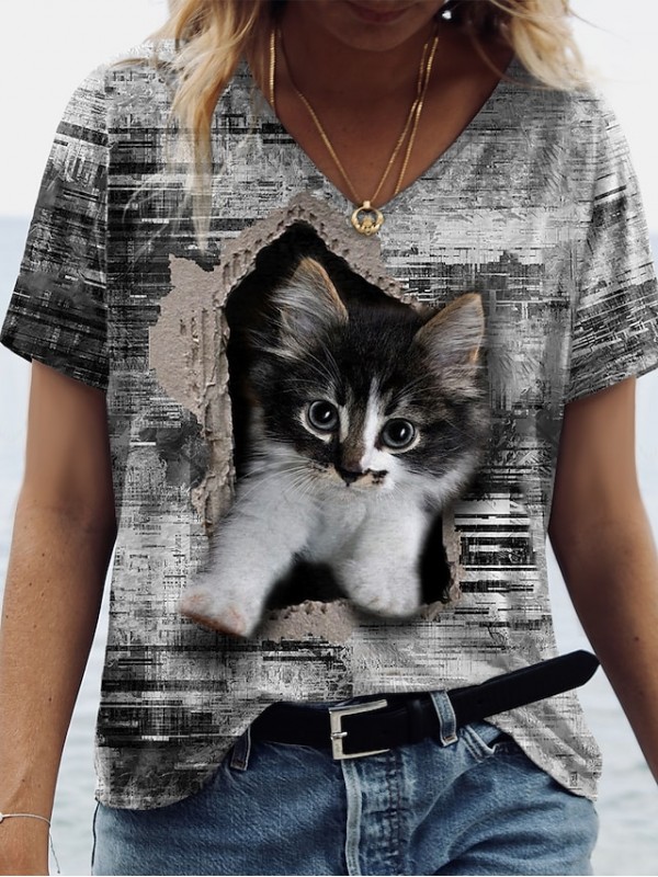 Women's 3D Cat Painting T shirt Cat 3D Print V Neck Basic Tops Gray #8980690
