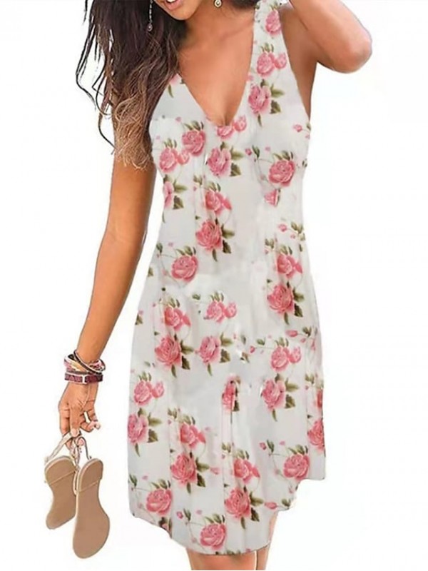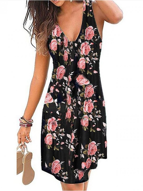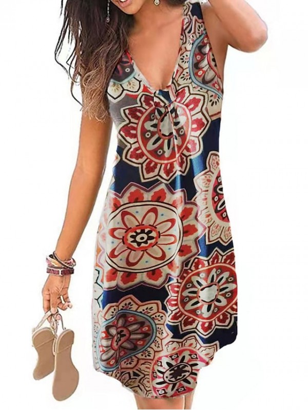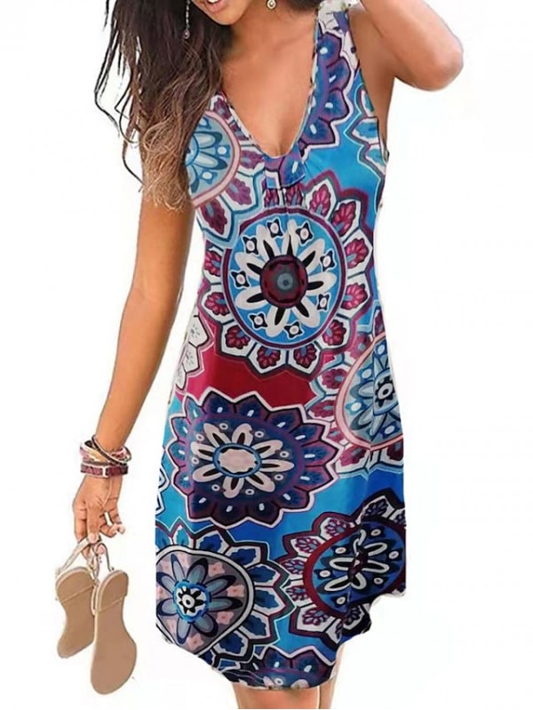 Women's A Line Dress Knee Length Dress YC0712-dark purple YC0712-Green leaves on black YC0712- wine red YC0712-Ethnic style blue YC0712-Ethnic wind red YC0712-Blue rose YC0712-big flower / V Neck #8654138