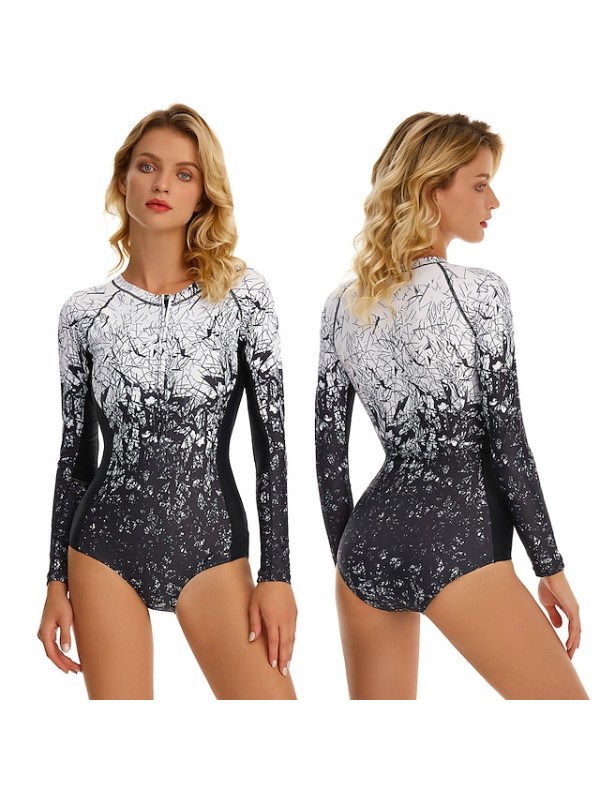 Gender: Women's, Age Group: Adults', Sports Clothing Sub Category: Rash Guard, One Piece Swimsuit, Clothing Type: Bathing Suit, Bodysuit, Activity: Athletic, Water Sports, Surfing, Beach, Swimming, Season: Autumn / Fall, Summer, Spring, Elasticity: Stretchy, Function: Quick Dry, UV Sun Protection, Elastic, Breathable, UPF50+, Lightweight, Fabric: Elastane, Terylene, Sleeve Length: Long Sleeve, Design: Front Zip, Pattern: Painting, Look After Me: Washable, Dry flat,