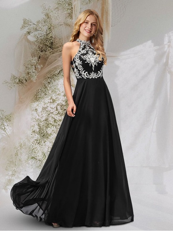 A-Line Backless Sexy Prom Birthday Dress Halter Neck Crisscross Back Sleeveless Floor Length Chiffon with Pleats Lace Insert Appliques 2022 #8995859