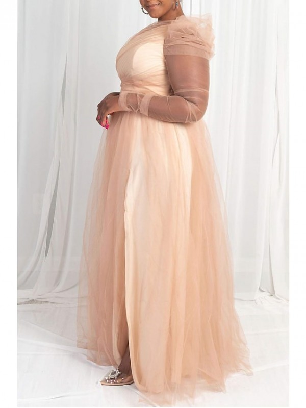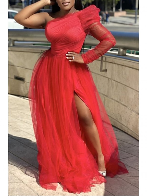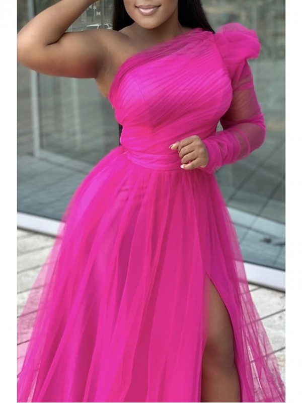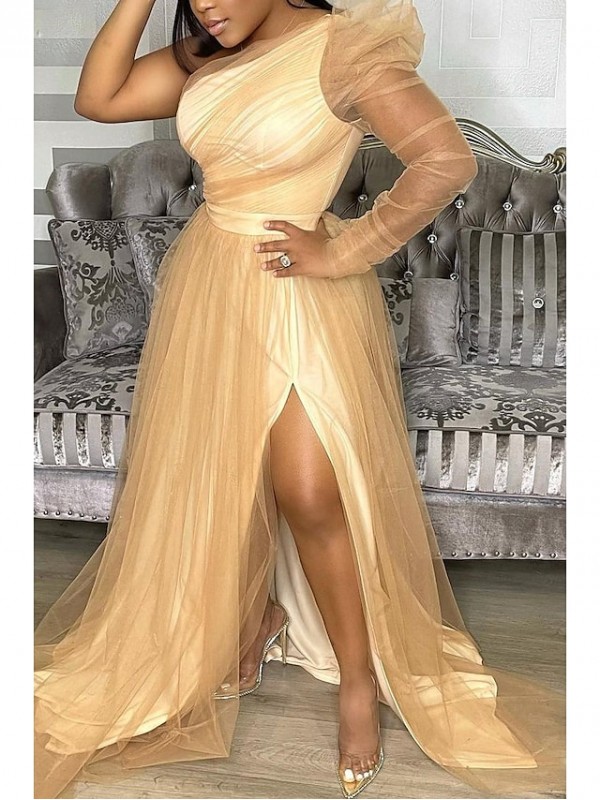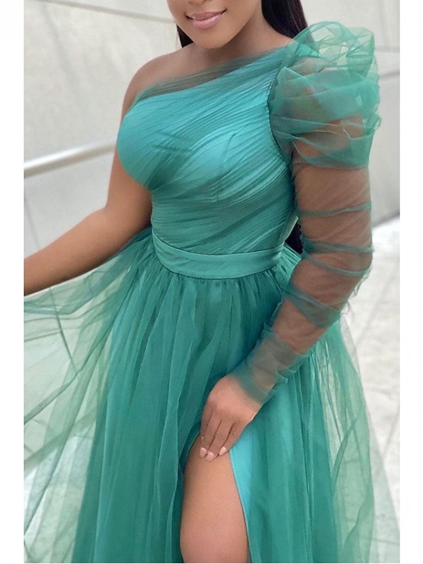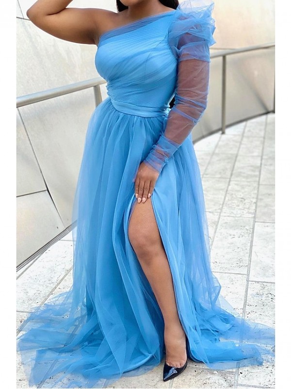 A-Line Plus Size Sexy Wedding Guest Formal Evening Dress One Shoulder Long Sleeve Sweep / Brush Train Tulle with Slit Pure Color 2022 #8984986