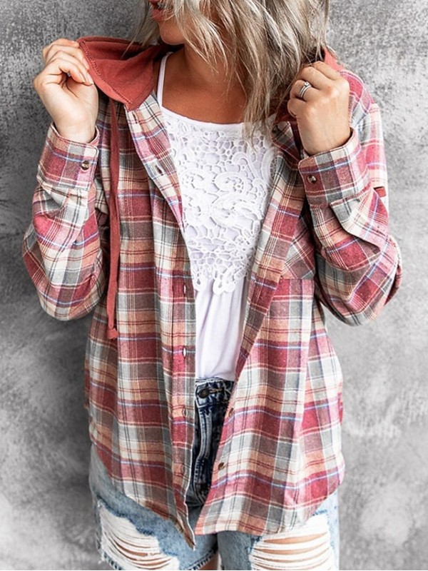 Women's Jacket Daily Holiday Valentine's Day Autumn / Fall Winter Regular Coat Regular Fit Casual Jacket Long Sleeve Plaid / Check Patchwork Red #8739091